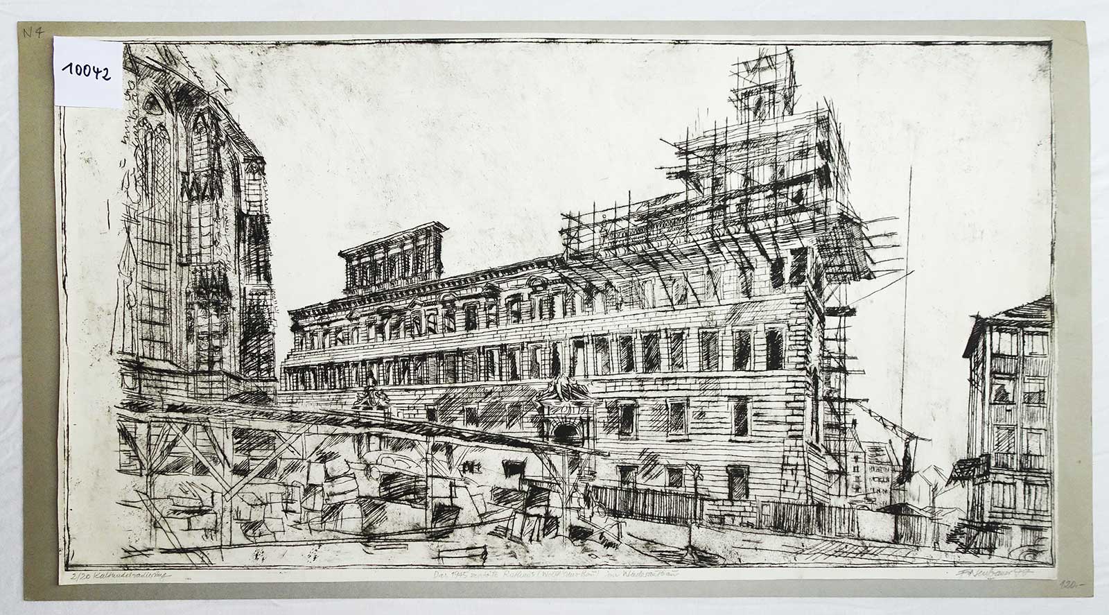 Kunstsammlungen der Stadt Nürnberg Die Wiederherstellungsarbeiten an dem _Gebäude aus Spätgotik und Renaissance dauerten fast sechs Jahre. Der erste Stock des spätgotischen Traktes beherbergt neben anderen Räumlich_keiten den instand gesetzten Rathaussaal mit den hohen gotischen Fenstern. Leider hat die ehemalige Wandbemalung von Albrecht _Dürer, die den Triumphzug des Kaisers zeigte, den verheerenden Brand während des _zweiten Welt_krieges nicht überstanden. Pläne einer Rekonstruktion der Wandgemälde sind bisher nicht realisiert worden. Im Keller des Gebäudes befinden sich die „Lochgefängnisse“, das bedeutet die Folterkammern und Verliese aus mittel_alterlicher Zeit. "